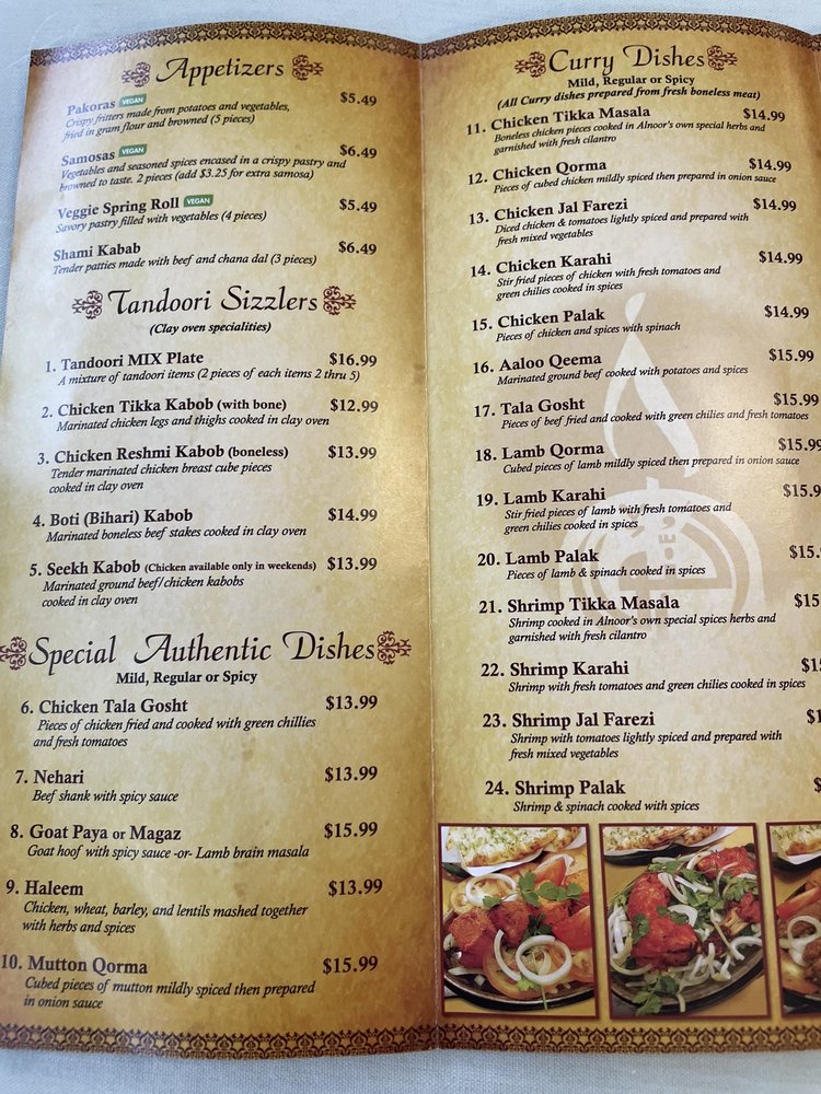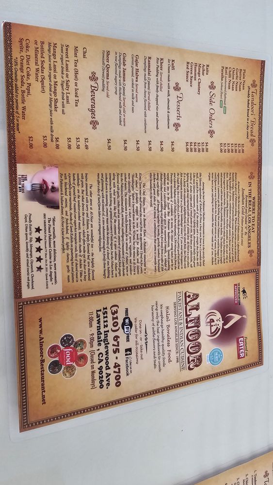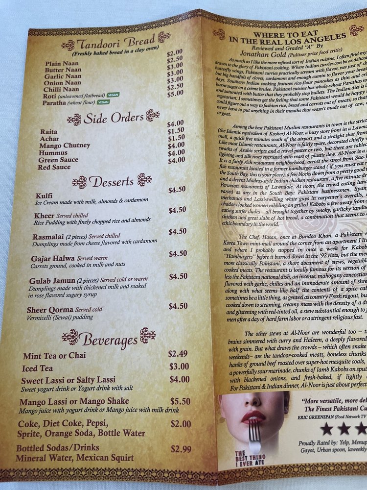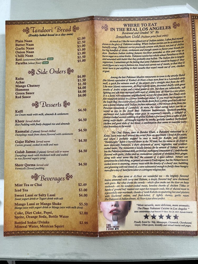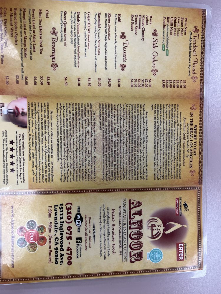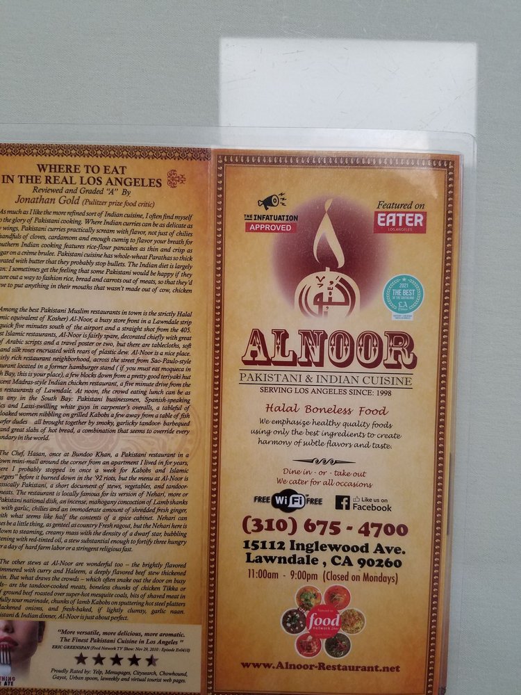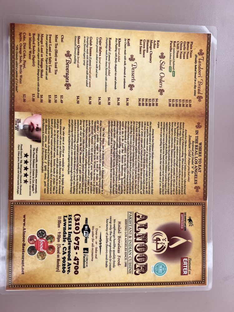 Al-Noor is a Pakistani and Indian restaurant located in Lawndale, CA, offering a wide range of Halal options. Known for its authentic cuisine and excellent service, Al-Noor has garnered rave reviews from customers. The menu includes popular dishes such as chicken tikka masala, tandoori chicken, palak paneer, and goat biryani. The restaurant provides a casual dining experience with options for vegan, vegetarian, and pescatarian diets. Customers praise the flavorful food, especially highlighting the chicken tikka masala and garlic naan. The atmosphere may not be fancy, but the friendly staff and delicious food make it a must-visit spot for those craving Pakistani and Indian flavors.